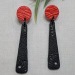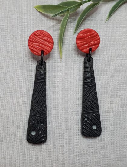 Make a bold statement with these sleek black and red post earrings. Featuring a striking stamped pattern accented with hand-applied marker details. They blend artistry with modern style. Lightweight and comfortable, they’re finished with hypoallergenic stainless-steel posts for everyday wear. Earrings measure 2 ½″ long.