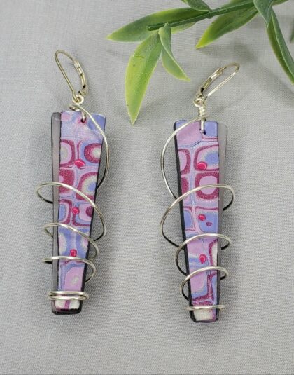 These one-of-a-kind, reversible polymer clay earrings are handcrafted using a clay extruder to create the intricate cane pattern. The reverse side is textured with a rubber mat and enhanced with shimmering mica powders for added depth and contrast. Delicate wire details add an elegant finishing touch. Finished with sterling silver lever-back ear wires, they offer secure, comfortable wear. Measuring 2 1/2″ long, these earrings make a graceful statement without feeling heavy.