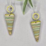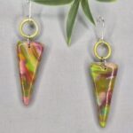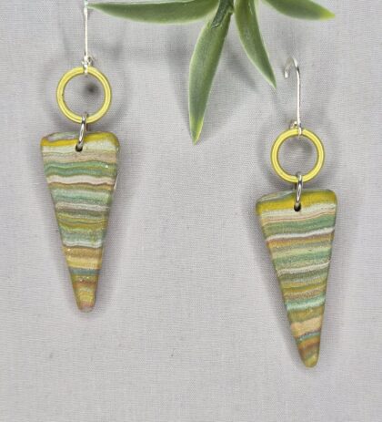 These one-of-a-kind, reversible polymer clay earrings are handcrafted using five different colors, which are chopped into various sizes and shapes. Foil is added to the clay, and the pieces are compressed together into a stack. The stack is then carefully sliced to reveal intricate, unique patterns. Finished with sterling silver lever-back ear wires, they are secure, comfortable, and lightweight. Measuring 2 1/2″ long, these earrings make a graceful statement without feeling heavy.