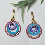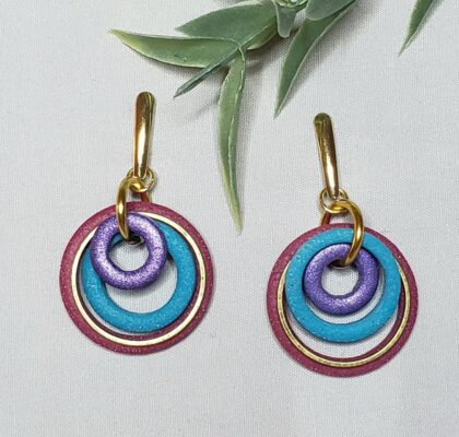 These playful polymer clay earrings add personality and pizzazz to any outfit. Each circle is a separate piece, allowing them to swing and move with ease. Earring posts/studs are gold-plated; they’re both stylish and comfortable. Earrings measure 1 1/4″ long.