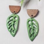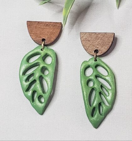 Handcrafted from polymer clay, these Swiss cheese monstera leaf earrings feature a warm green hue brushed with shimmering mica powder for a natural, subtle shine. Lightweight and comfortable, they’re finished with wooden stainless steel posts and measure 1¾″ long.