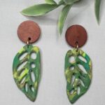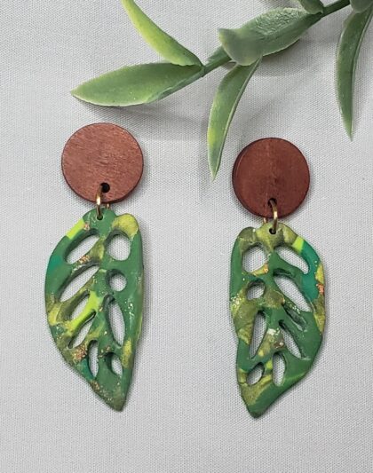These Swiss cheese monstera leaf earrings are handcrafted from polymer clay. These earrings feature a multi-green hue for a natural, subtle shine. Lightweight and comfortable, they’re finished with wooden stainless steel posts and measure 1¾″ long.