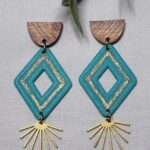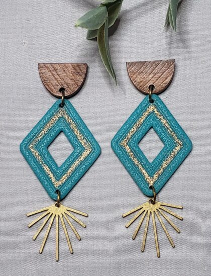 These handcrafted polymer clay triangle earrings are brushed with mica powder for a soft, metallic sheen. Wooden ear posts with stainless steel studs add a natural touch. Earrings measure 2 ¾″ long.