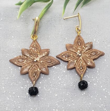 Handcrafted from lightweight polymer clay, these snowflake earrings shimmer with delicate gold glitter for a sparkling, refined winter look. Unique, tear-drop, gold-plated posts provide lasting comfort for sensitive ears. Each pair measures 2″ long—perfect for adding seasonal sparkle to your style.