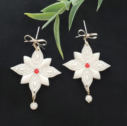 Handcrafted from lightweight polymer clay, these silver-toned snowflake earrings shimmer with delicate silver foil and sparkling gemstones for a refined winter look. A festive bow stud adds a touch of holiday charm, while stainless steel, hypoallergenic posts provide lasting comfort for sensitive ears. Each pair measures 1 ¾″ long—perfect for adding seasonal sparkle to your style.